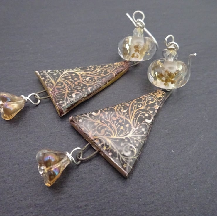 A pair of earrings made with handmade sterling silver ear wires, handmade lampwork glass beads, handmade ceramic connectors with a tree pattern and Czech glass flower beads.