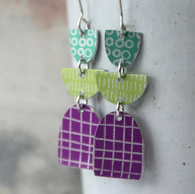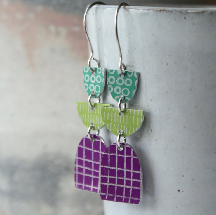 A lovely pair of earrings handmade from sterling silver and anodised aluminium. The aluminium pieces have circle, and line patterns which have been applied to the metal, then dyed. The ear wires are hand made from sterling silver.