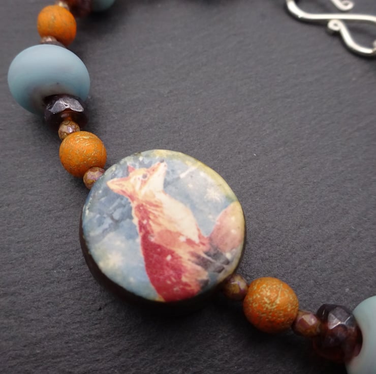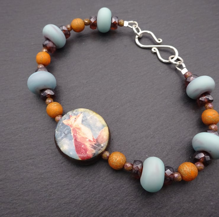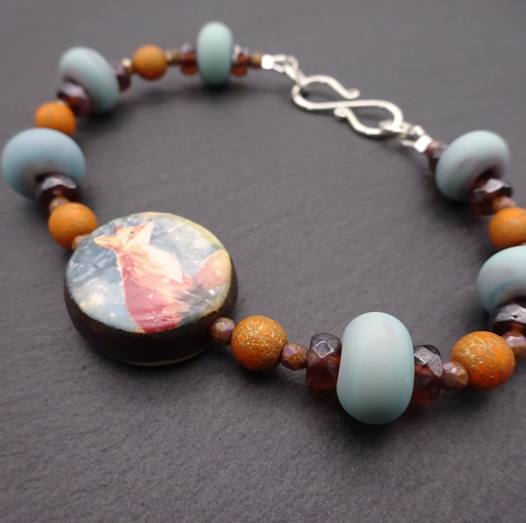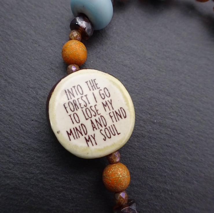 A bracelet made with handmade lampwork glass beads, Czech glass beads and a handmade ceramic bead. The ceramic bead has a image of a fox on one side and the words 'into the forest I go to lose my mind and find my soul' on the other.