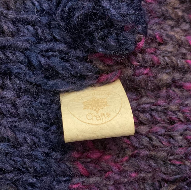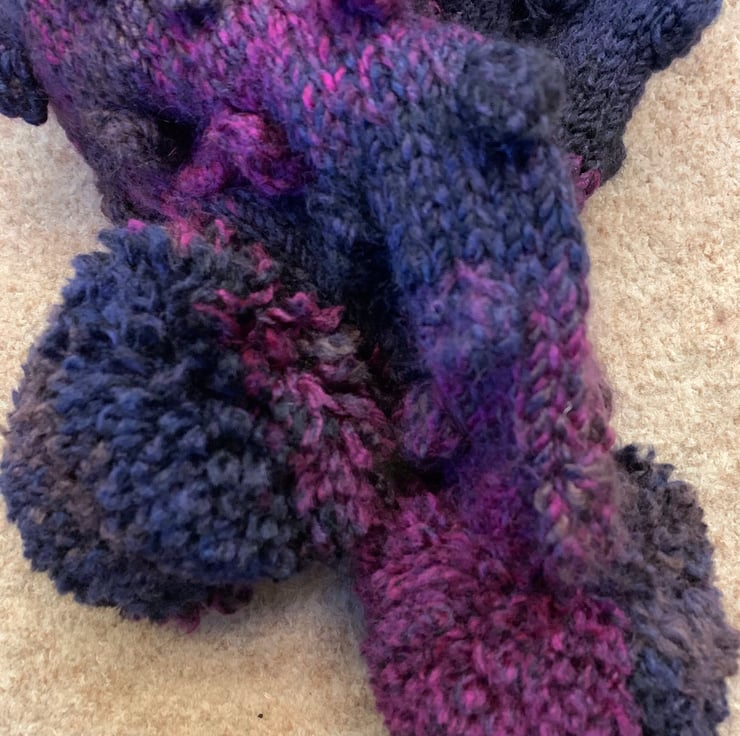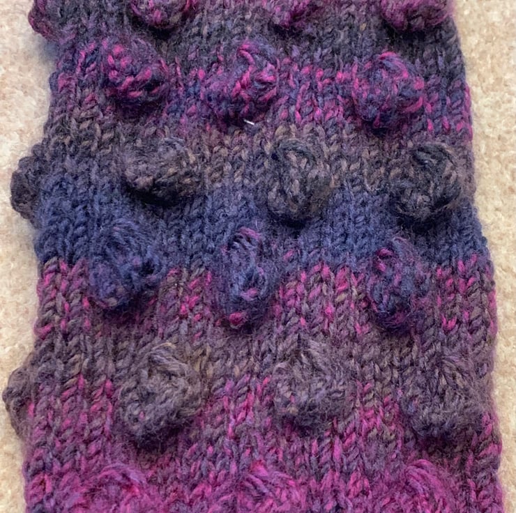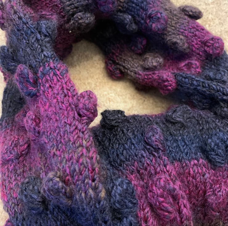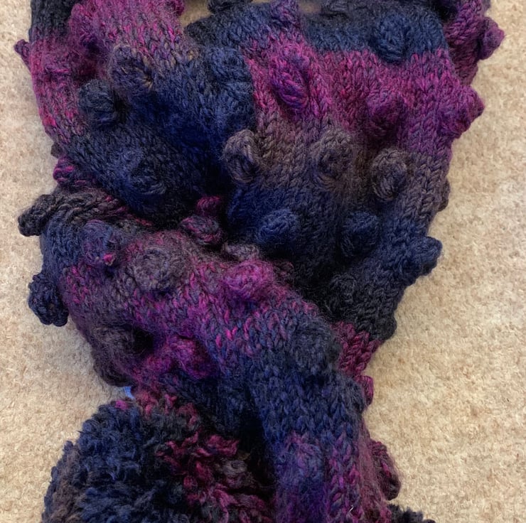 Hand knitted bobble scarf knitted in James Brett Marble Chunky 100% acrylic yarn. Scarf is made with my own design bobble pattern in ombré purples and measures 150cm in length. It has a large pom pom at each end. Would made a beautiful gift.