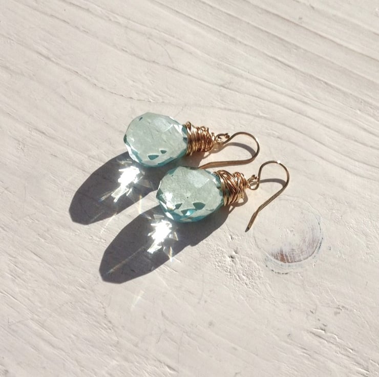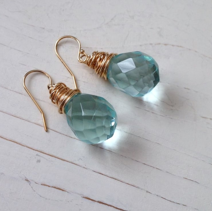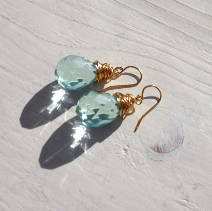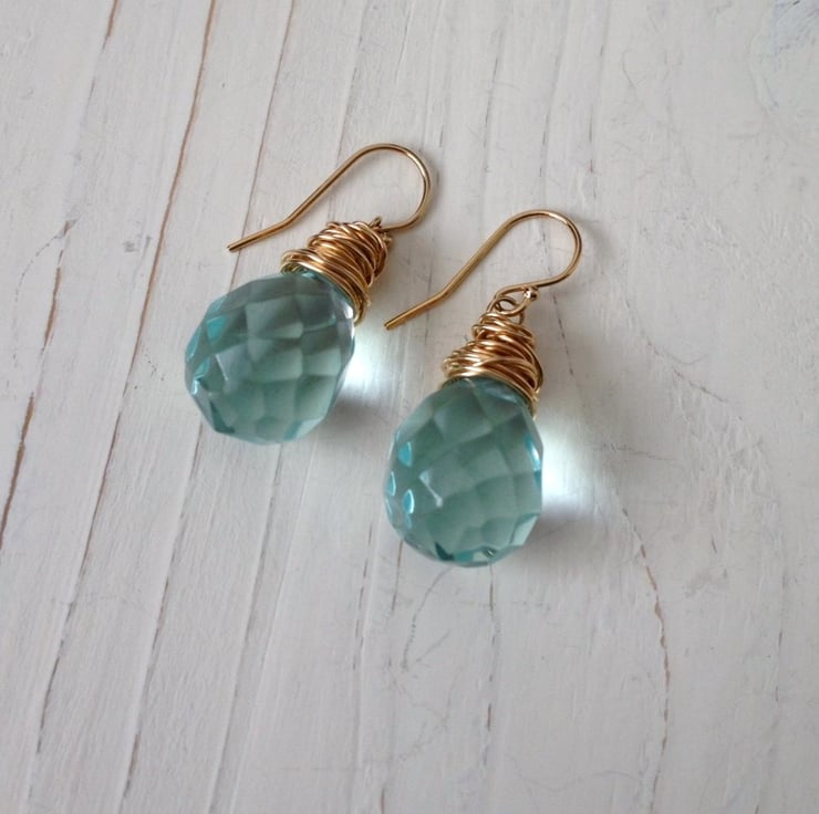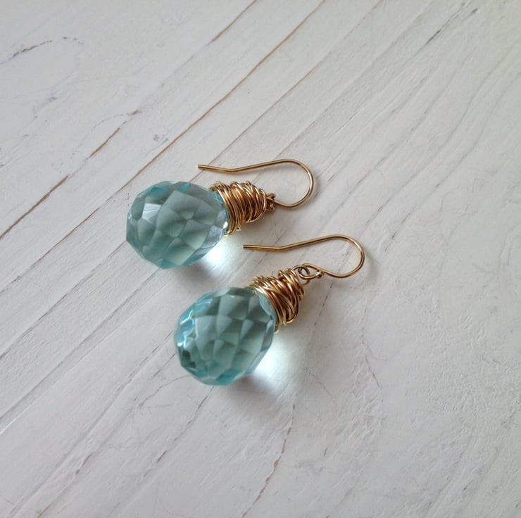 Pretty pale aqua blue briolette glass bead drop earrings, wire wrapped with gold filled wire and hung on gold filled ear wires these little earrings with their pretty facets catch the light beautifully. They are very comfortable to wear with a nice weight to them and they swing beautifully as you walk.