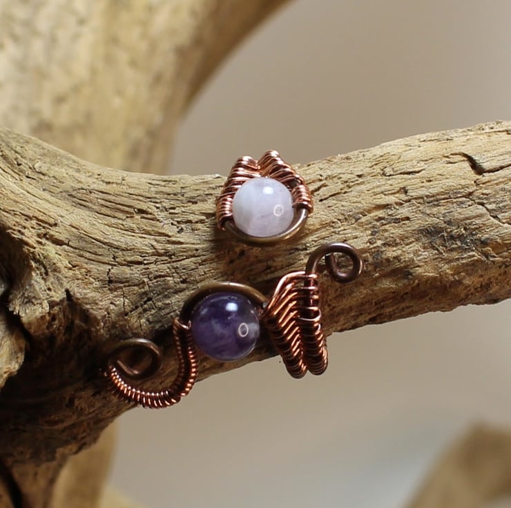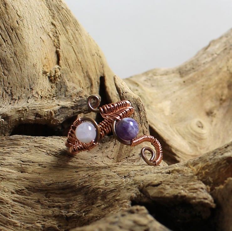 An Adjustable copper ring featuring two beautiful amethyst beads. The body of the ring has been hand made using two different gauges of copper wire that have been meticulously woven together.