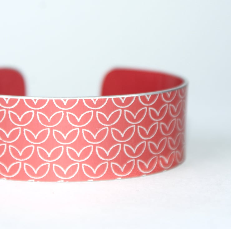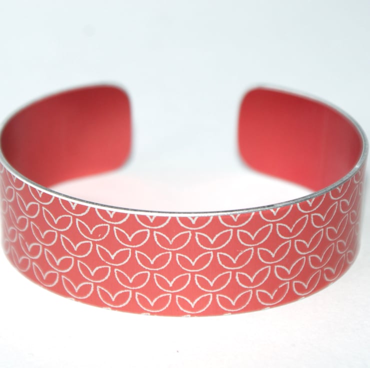 A striking bracelet/cuff made from anodised aluminium with a leaf pattern from my own hand drawing. I made the drawing into a resist and applied it to the metal. I then dye the aluminium, seal it and remove the resist which leaves the pattern showing in the original colour of the metal. The cuff is then made using traditional metalworking techniques.