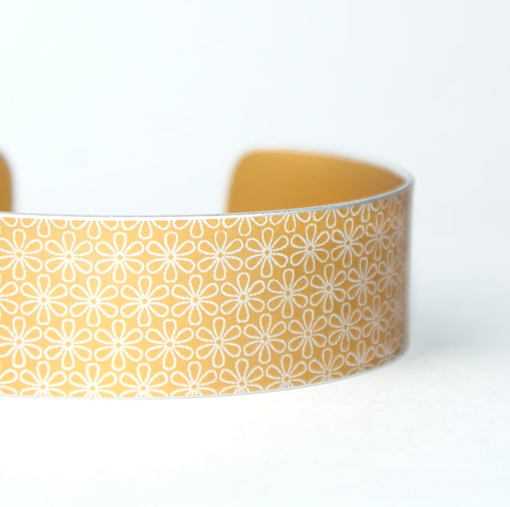 A quirky bracelet/narrow cuff made from anodised aluminium with a mini print of flowers. I drew this pattern digitally, made it into a resist and applied it to the metal. I then dye the aluminium, seal it and remove the resist which leaves the pattern showing in the original colour of the metal. The cuff is then made using traditional metalworking techniques.