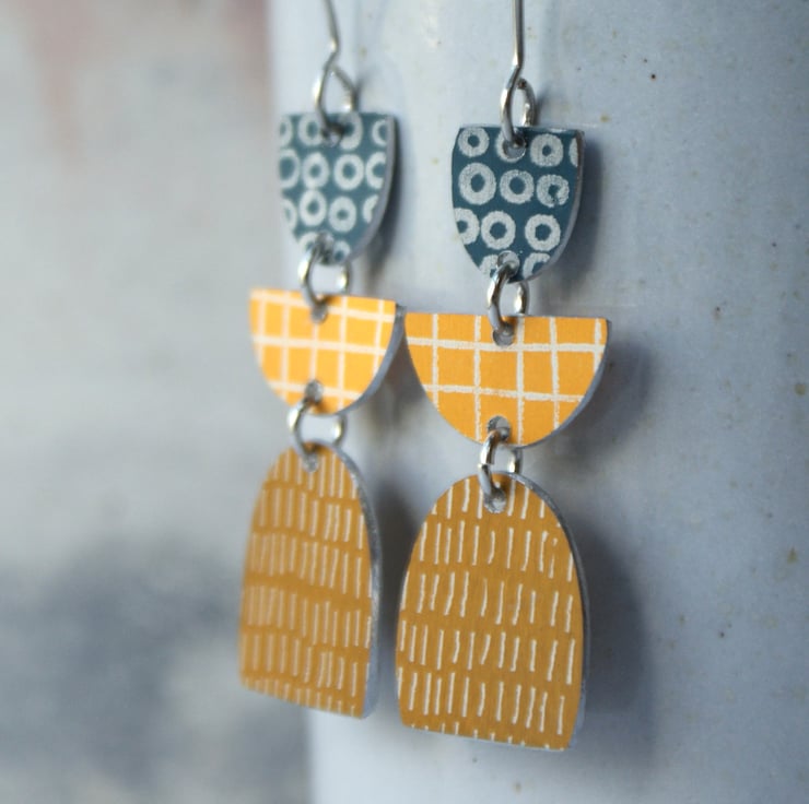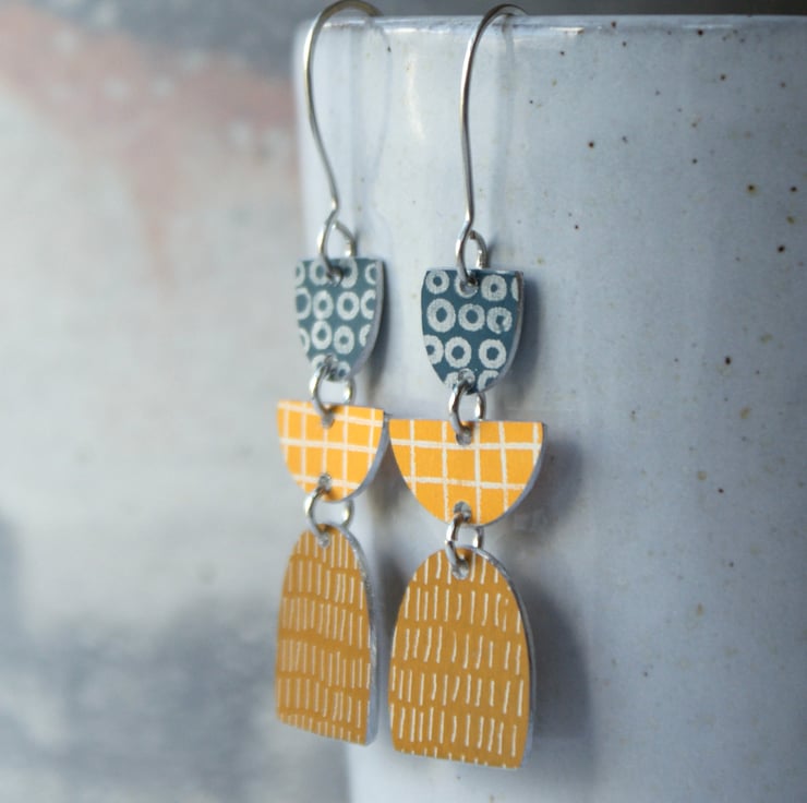 A fab pair of earrings handmade from sterling silver and anodised aluminium. The aluminium pieces have circle, and line patterns which have been applied to the metal, then dyed. The ear wires are hand made from sterling silver.