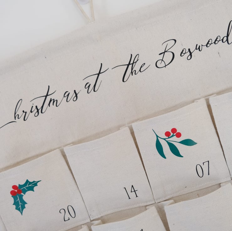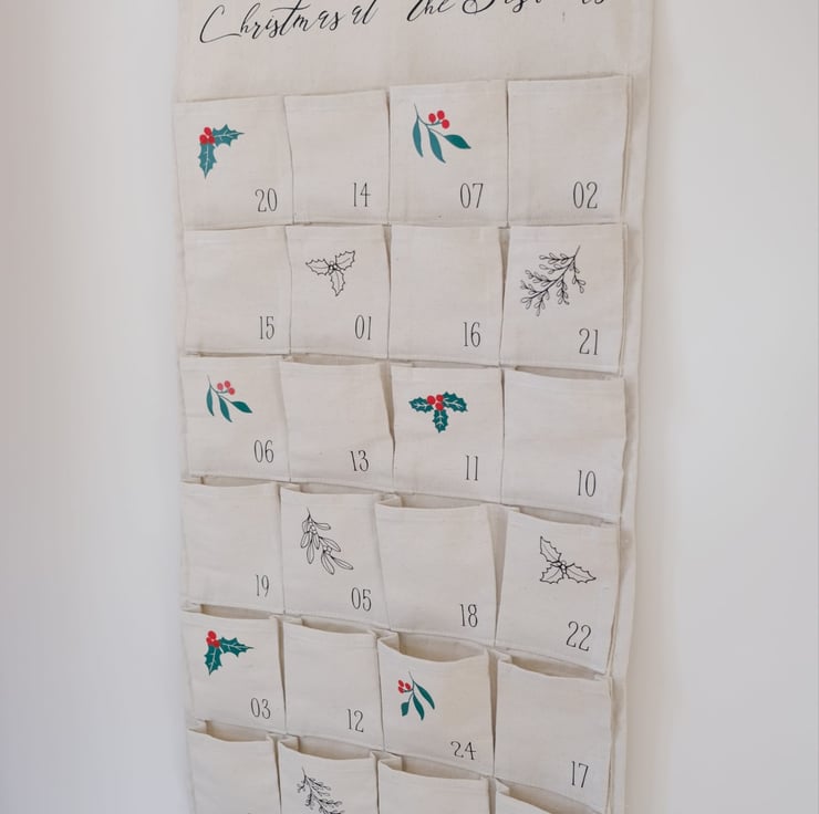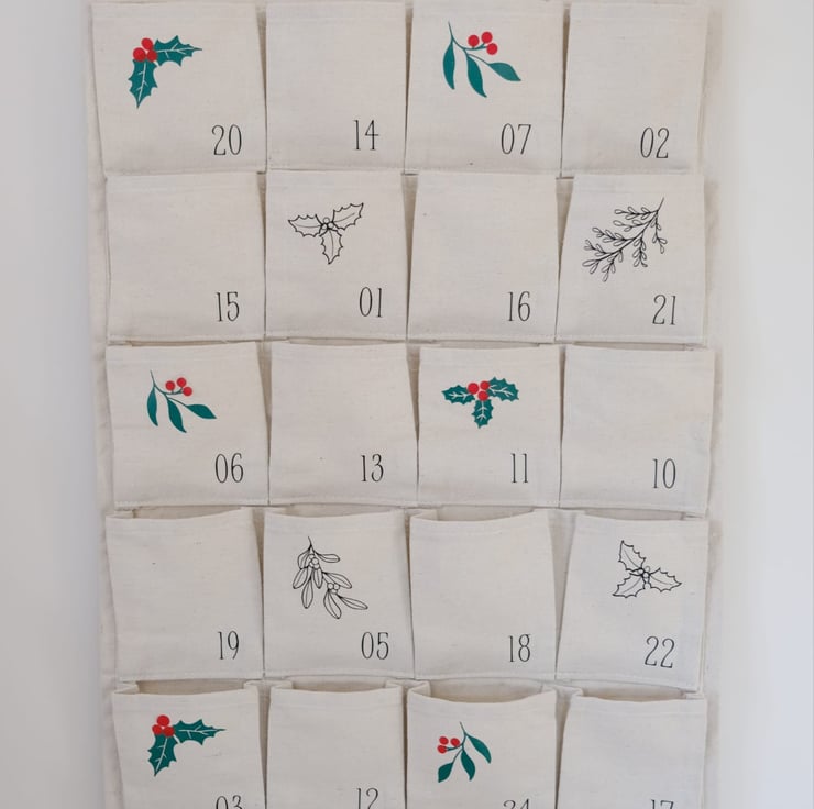 Embrace the holiday spirit with a Reusable Canvas Christmas Advent Calendar! This beautifully crafted calendar is adorned with charming holly and mistletoe illustrations, adding a touch of festive magic to your home.