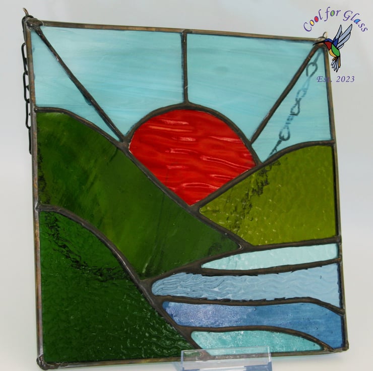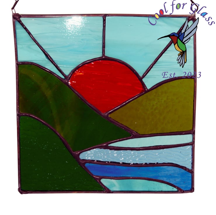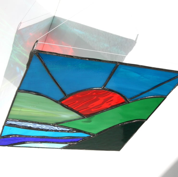 A colourful decoration that will brighten any window and instantly improve well-being. Inspired by sunny days walking in the countryside. A winding river flowing through the valley surrounded by hills. The blue sky with wispy clouds overhead and the last heat of the day warming your face. A perfect gift for those that appreciate the countryside. Watch the colours enhance and their reflections add that extra depth to the scene when the sun shines.