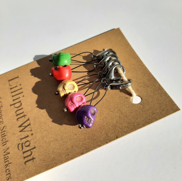 A set of five locking stitch markers made from small skull beads for use in crochet or as a progress keeper in knitting.