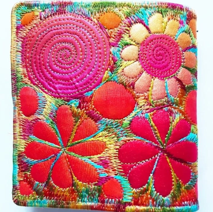 Made from layers of fabric including hand dyed Egyptian cotton and silk fabrics using the free machine embroidery style of sewing
