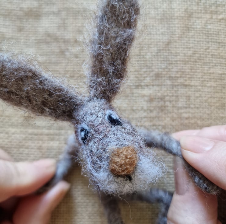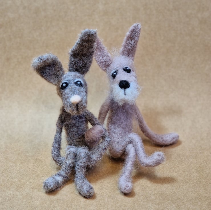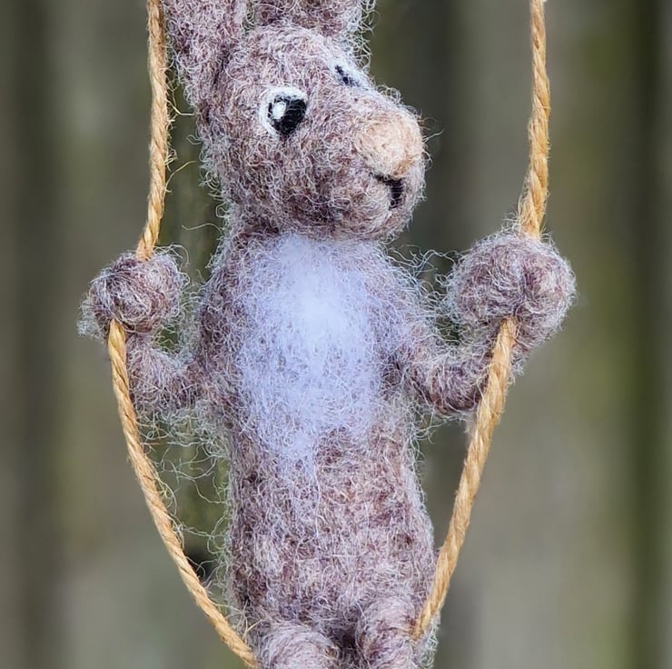 A needlefelt kit, presented in a little organza bag with full colour photo instructions, wool, wires a felting pad and two felting needles – to make two cute little grey hares who will cling to something or you can simply pose them!