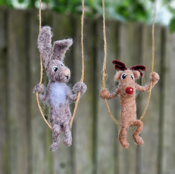 A needlefelt kit, presented in a little organza bag with full colour photo instructions, wool, wires a felting pad and two felting needles – to make two cute little grey hares who will cling to something or you can simply pose them!