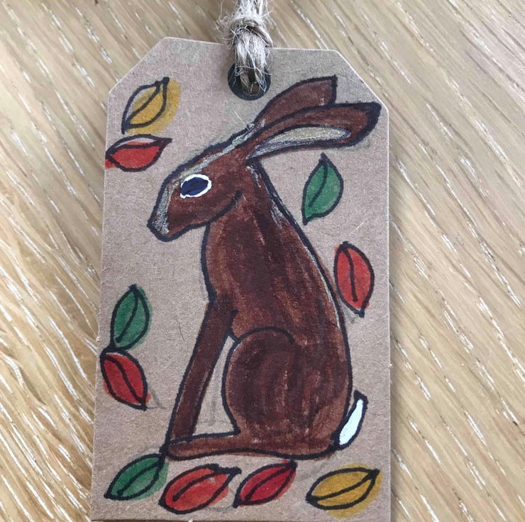 Four hand drawn and coloured unique gift tags . With an Autumn theme, hare , owl, seed heads and toadstools.