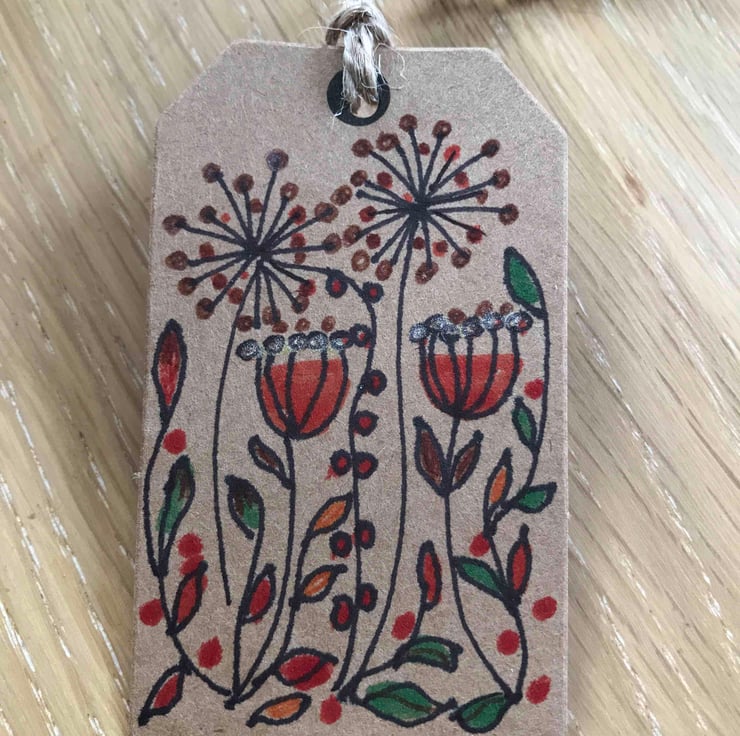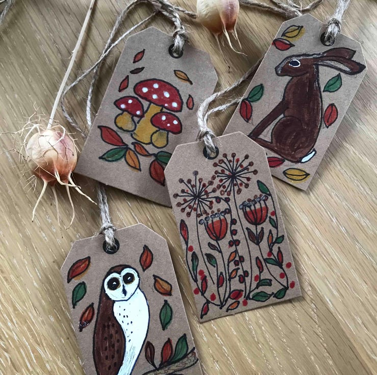 Four hand drawn and coloured unique gift tags . With an Autumn theme, hare , owl, seed heads and toadstools.