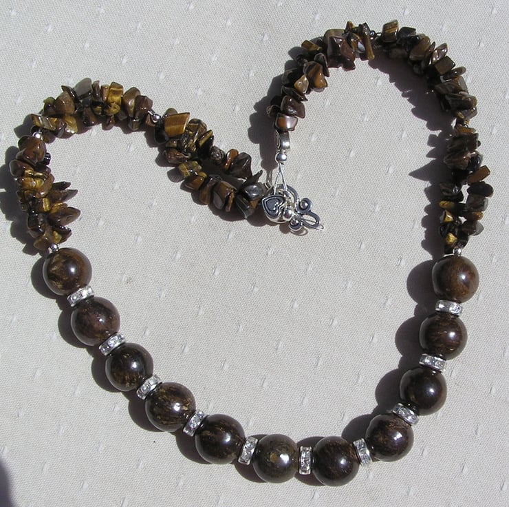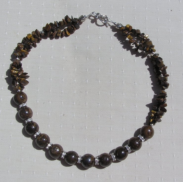 The Central Swathe of this Gorgeous Crystal Gemstone Necklace is made from Chunky Brown Bronzite large round beads each separated by a Glistening Crystal studded spacer which then flow into double-stranded Gold Tiger Eye Gem-chips - a rich warming combination that will look stunning either worn casually or with something more Elegant for a Special Evening out