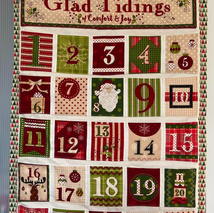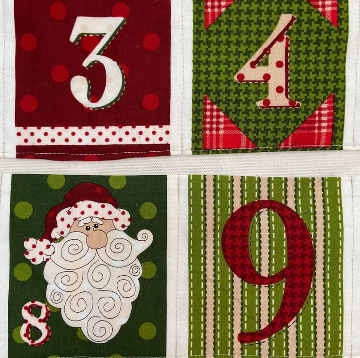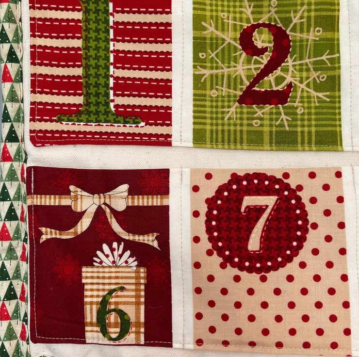 Quilted Advent Calendar with 25 large pockets and edged in a contrasting fabric, with a plain fabric reverse which has been hand finished.