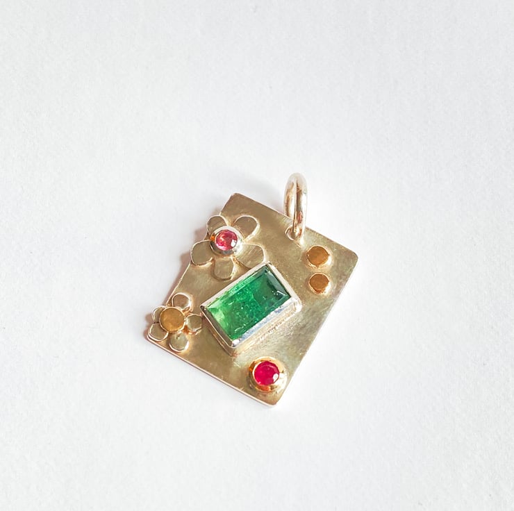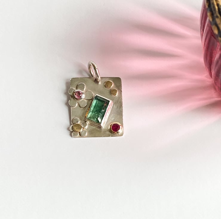 Green and pink tourmaline with ruby are set into 9ct gold and sterling silver unique gemstone pendant. Handmade using traditional metal smithing techniques.