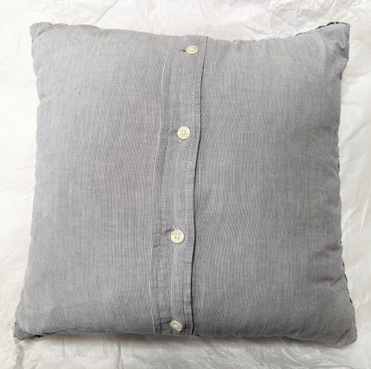 Original coastal inspired appliqué cushion made using recycled materials. Mainly made from old clothing including a shirt to form the button fastening.
