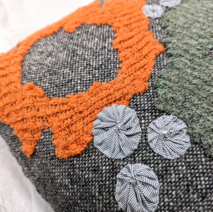 As my embellishing technique takes a long time, I developed this range of homeware using the alternative technique of applique. Still all handmade using old clothing but quicker so can provide at a lower price.