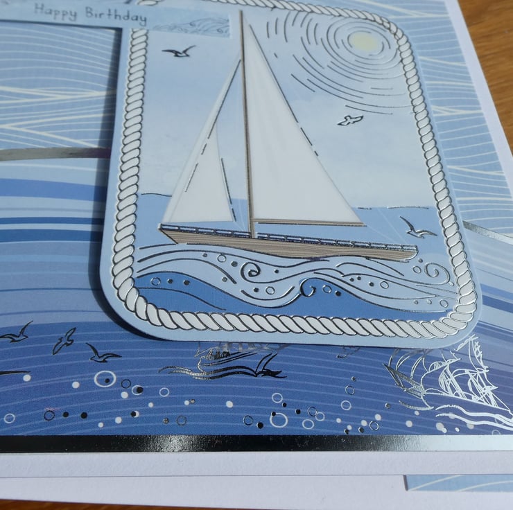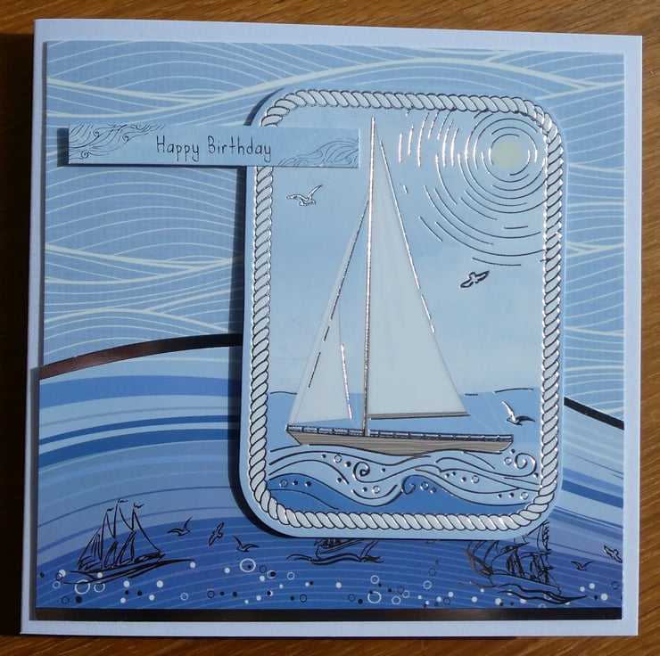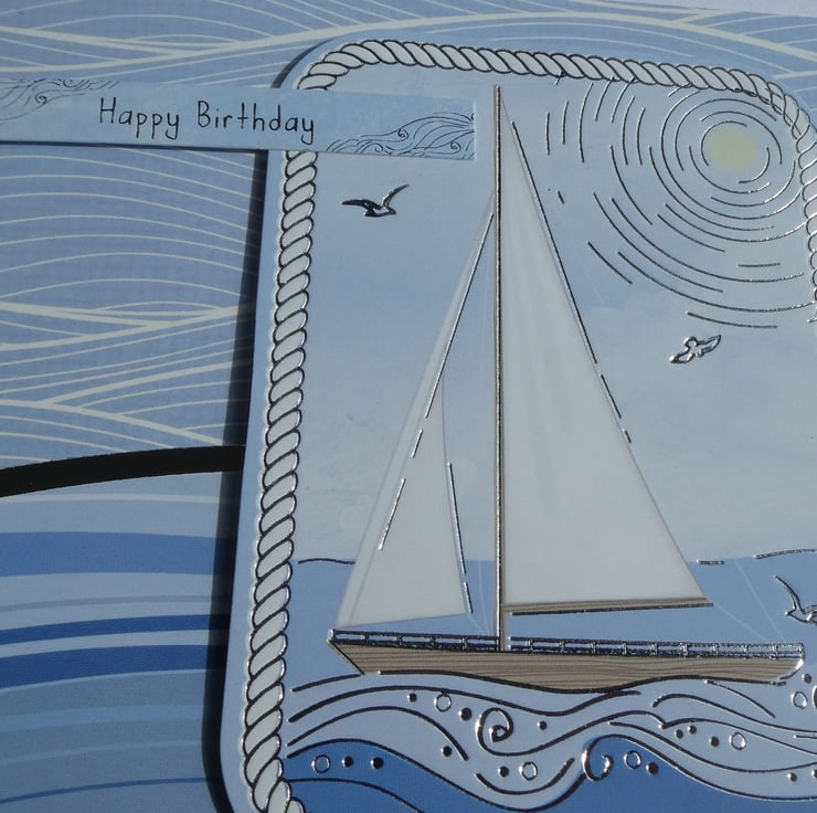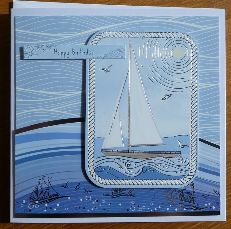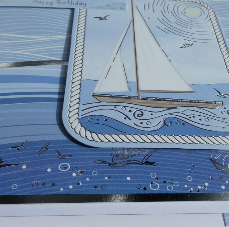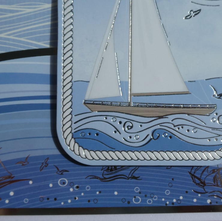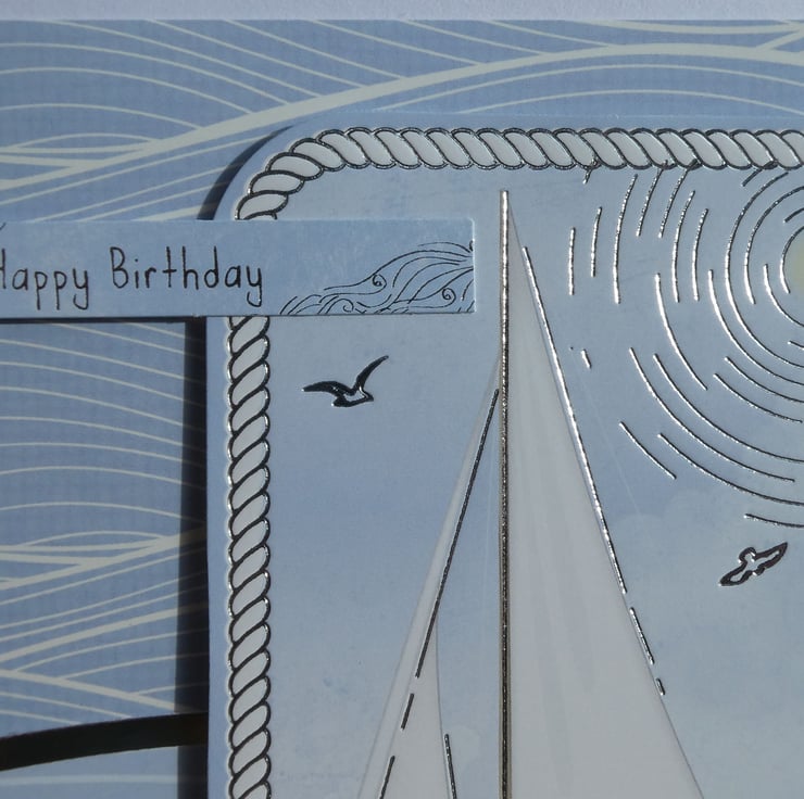 A printed image of a boat with white sails, sea birds, waves and sunshine all outlined in silver foil has been added, slightly raised on foam pads and the design has been finished with a Happy Birthday message.