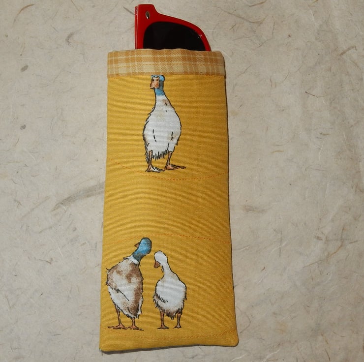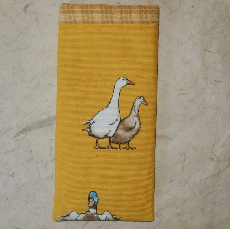 This is an attractive glasses or sunglasses case featuring duck and geese. It is made from cotton print fabrics with a layer of wadding for protection and a contrast check trim and lining. This is a slip in style glasses case, if you require a case which fastens please view my other listings.