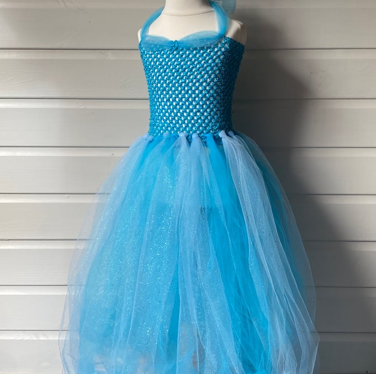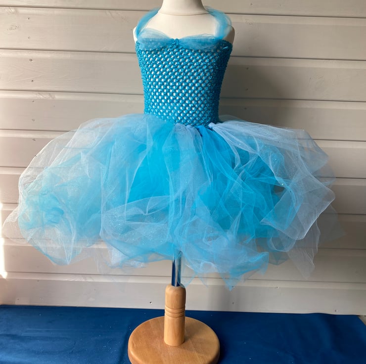 Pretty handmade blue glitter tutu dress. Made using a stretchy crochet bodice which will stretch from 38cm to 70cm in width. The skirt is made from layers of blue glitter tulle and blue tulle fabric. The dress measures 80cm from shoulder to bottom of the dress but the tulle fabric on the skirt can be fluffed up to make the skirt both fuller and wider.