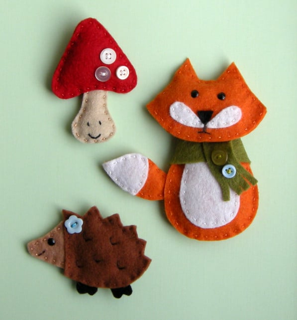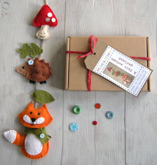 Make and sew a woodland themed hanging decoration with this sewing kit. Includes a cute . toadstool with smiley face, hedgehog and a fox with a scarf with felt leaves attached. the garland would look great in a child's bedroom, play room or just hanging up for the autumn season.