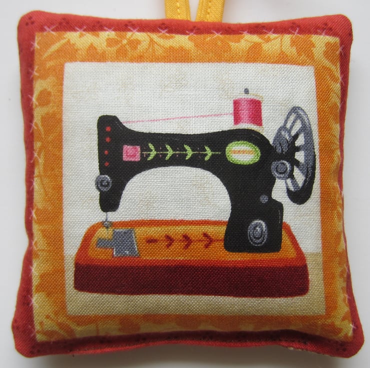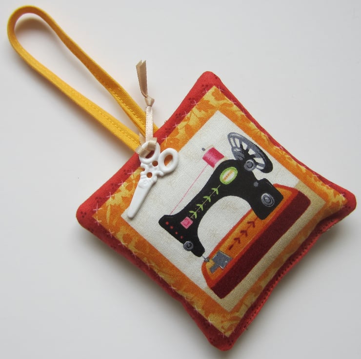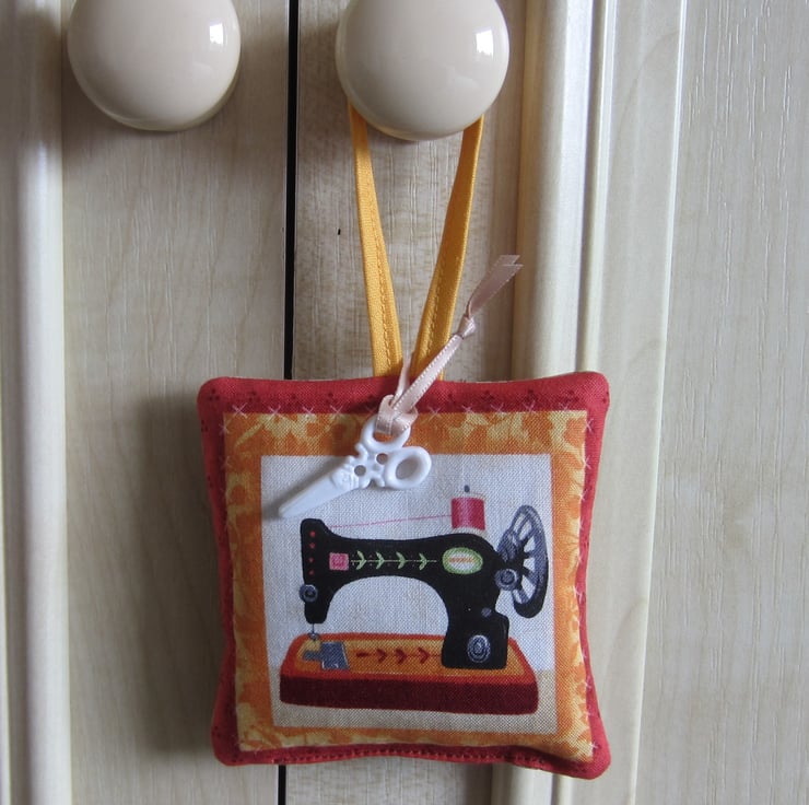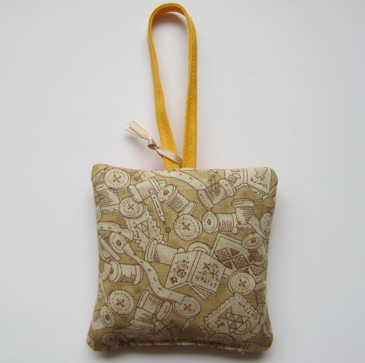 Hanging lavender sachet made from a sewing items fabric, featuring a vintage sewing machine on the front and another sewing items fabric on the back featuring cotton reels, tape measures, pins etc.