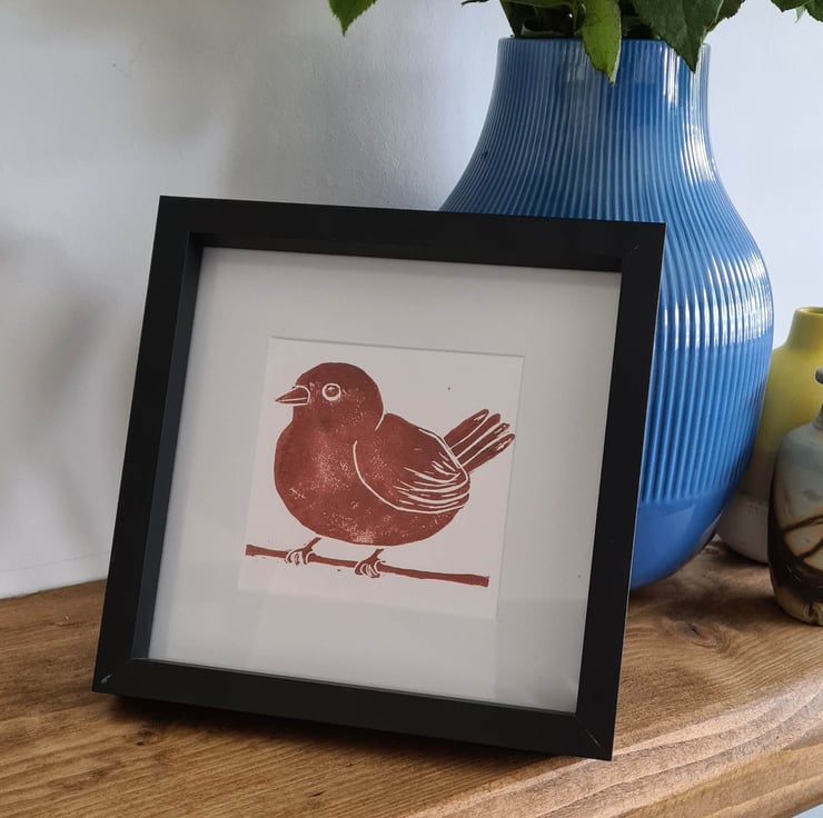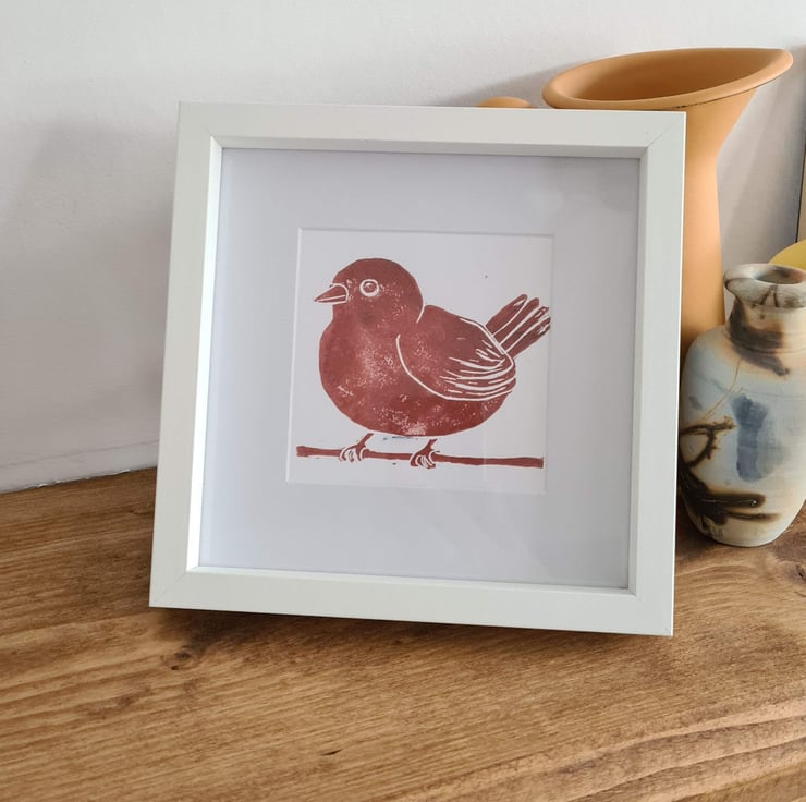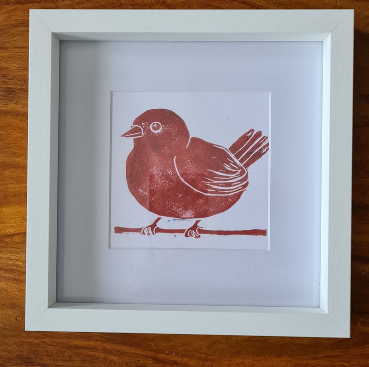 This is one of my handprinted linocut notecards, in a mounted frame, which can be black or white. It is of a small red bird which I made after taking a photo of it in our garden.