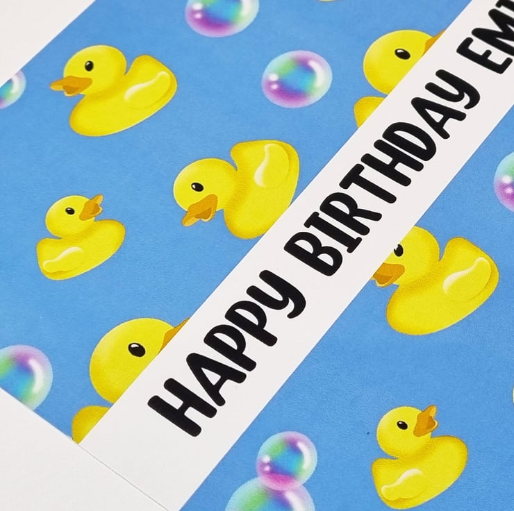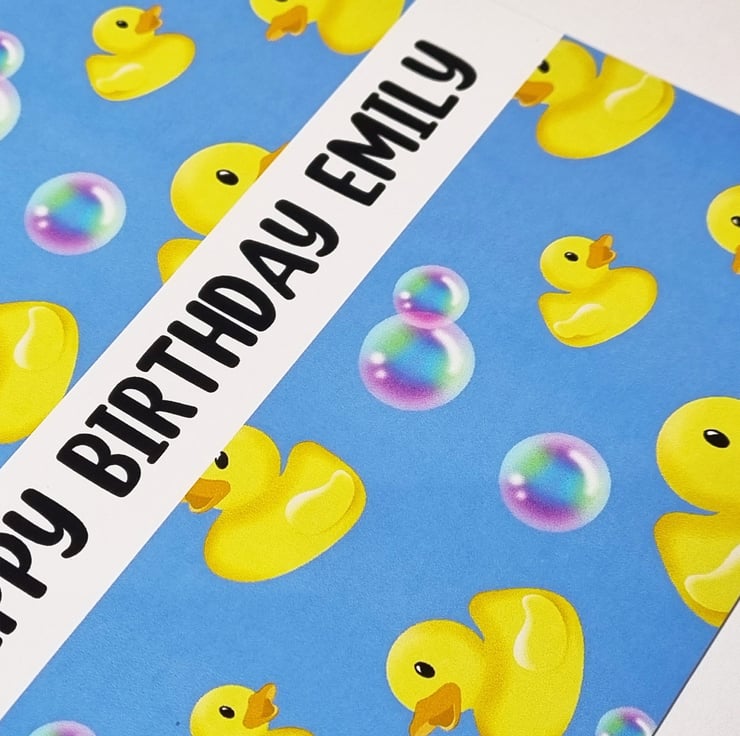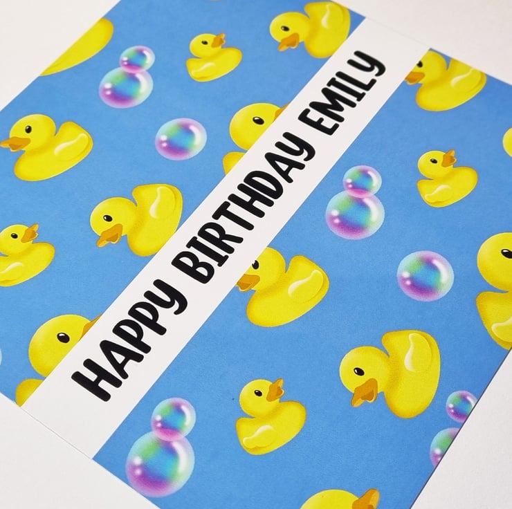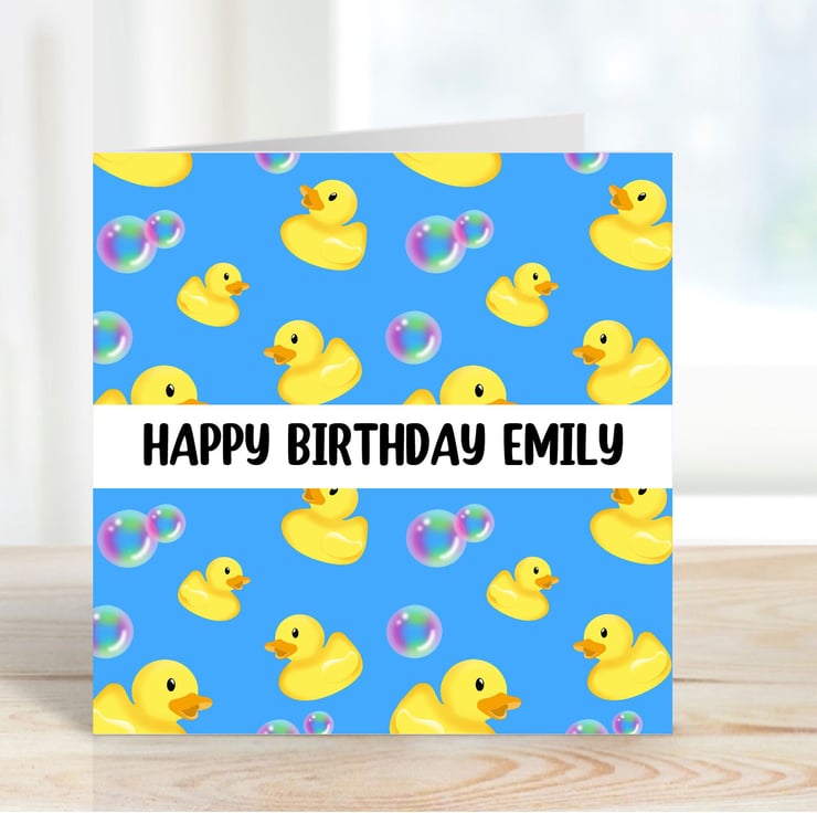 A handmade personalised birthday card featuring lots of yellow rubber ducks and colourful bubbles !