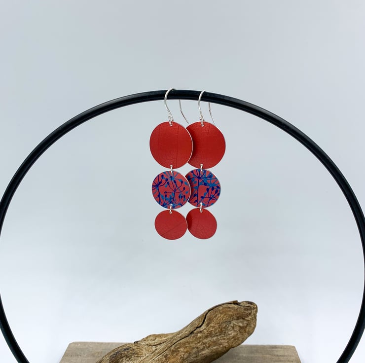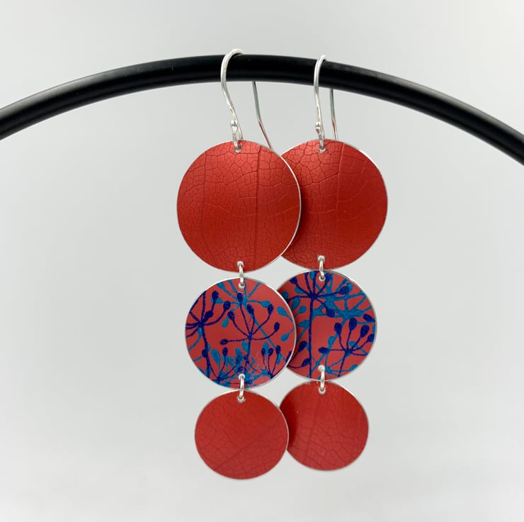 Statement dangly earrings made from hand dyed and printed anodised aluminium. Two discs have been textured with a leaf skeleton, the other printed with a cow parsley design.