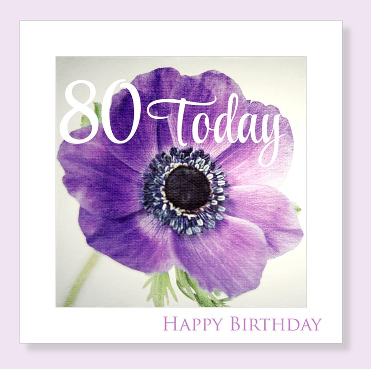 Floral 80th birthday card featuring a beautiful purple Anemone on a pale green background with white and purple text, and a vintage feel.