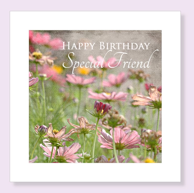 Special friend birthday card featuring beautiful pink and red Cosmos. The perfect birthday card for a special friend!