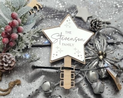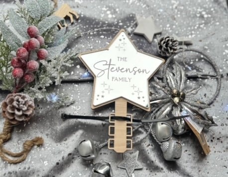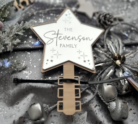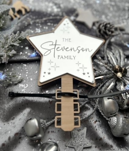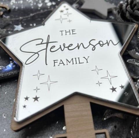 Our Tree Topper has been cut from 4mm American maple and 3mm Silver Mirror which has been engraved with the words "The "surname" Family" and attached to the wood. The Silver Mirror has been engraved into the star and therefore cannot be removed like other methods of engraving.
