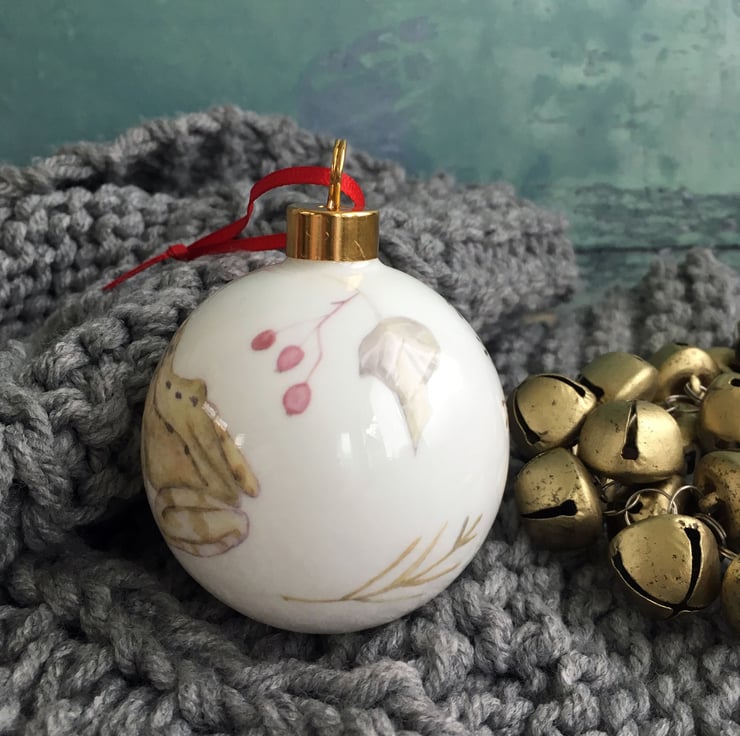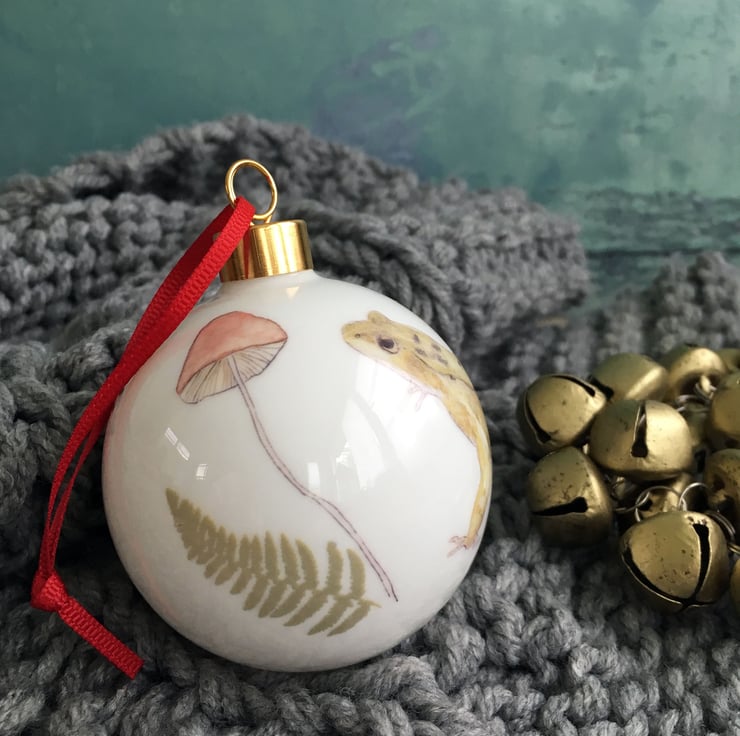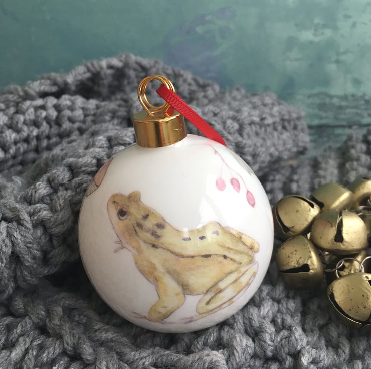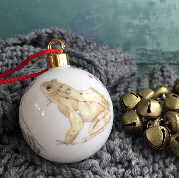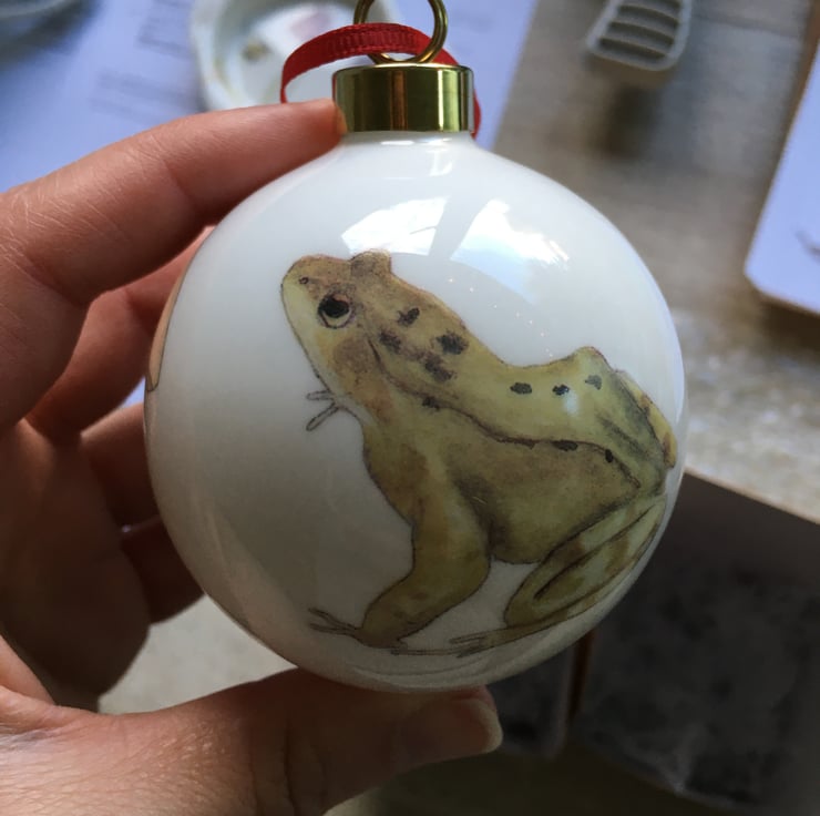 My watercolour painting of a frog is printed as a ceramic transfer and then hand cut and applied to a fine bone china Christmas tree bauble. Each bauble will have a different combination of imagery meaning each one is unique, creating a special heirloom decoration that can be treasured each year.