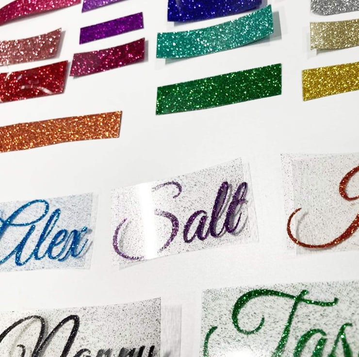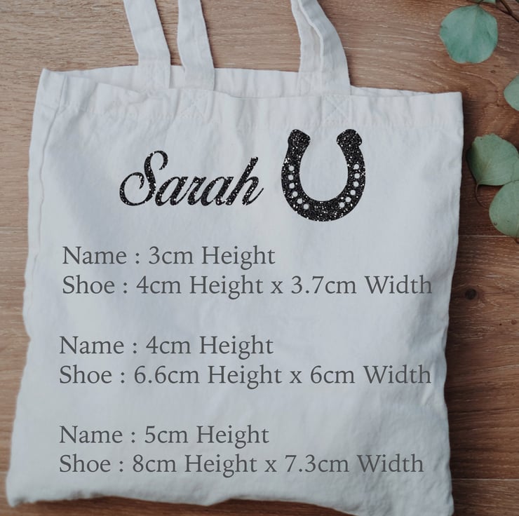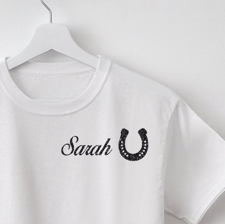 Horse Shoe symbol glitter iron on name label. Only suitable for polyester and cotton material. Great for t-shirt designs.