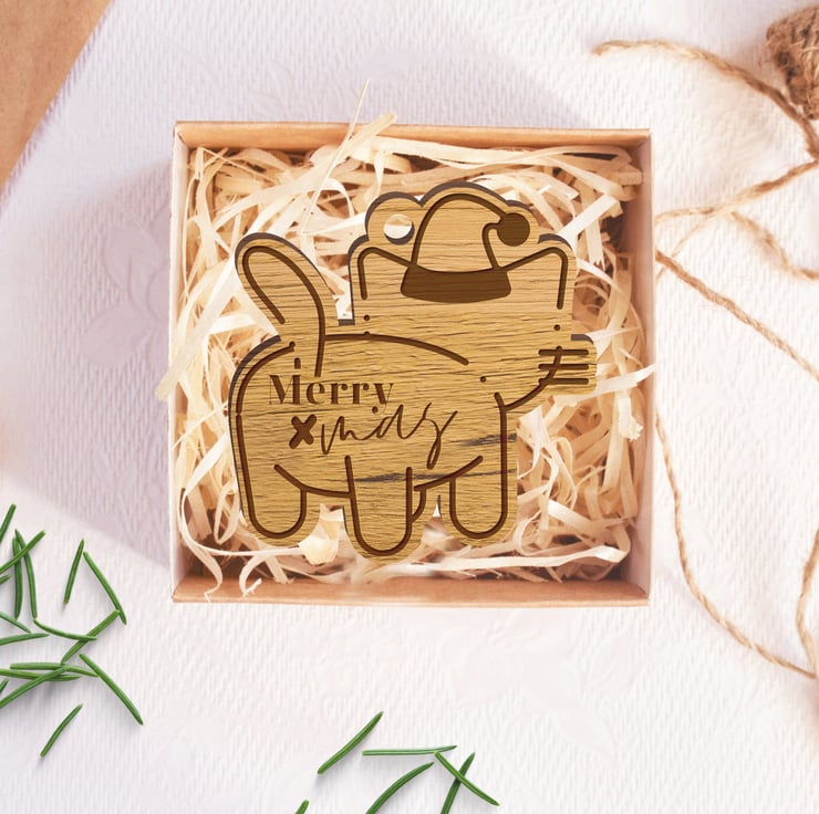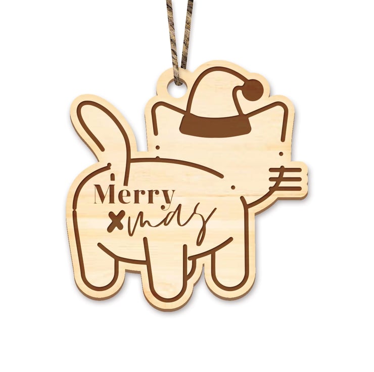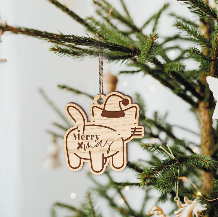 This Christmas, give your tree a feline flair with our purr-fect cat-themed ornament! Engraved with 7 different wood options, it's the ideal stocking stuffer or hilarious addition for your own tree. Get your paws on one today!