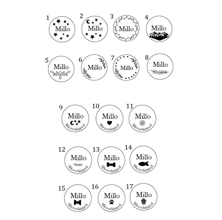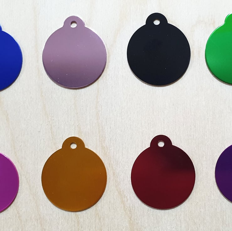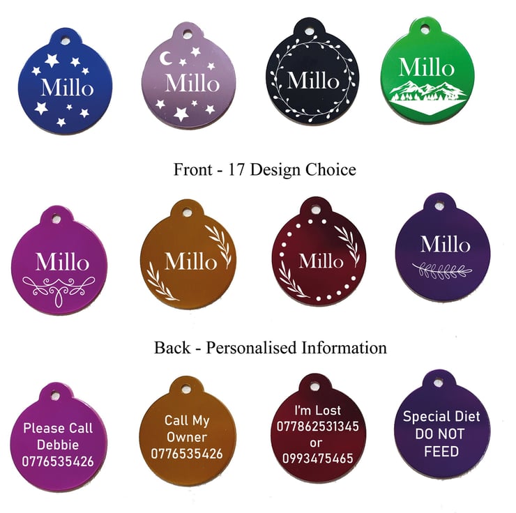 Beautiful personalised metal Dog Cat ID tags. We have 8 wonderful colours to choose from and 17 Designs to choose from. We can personalise the tags with key information such as Pet Name, Contact Details, "I'm Chipped" etc. Please provide the details during checkout.