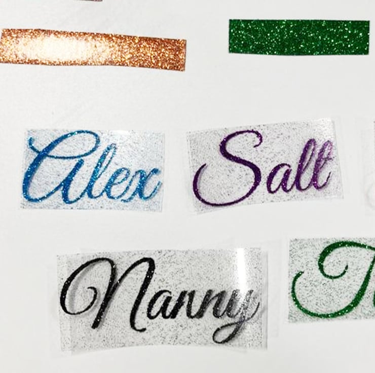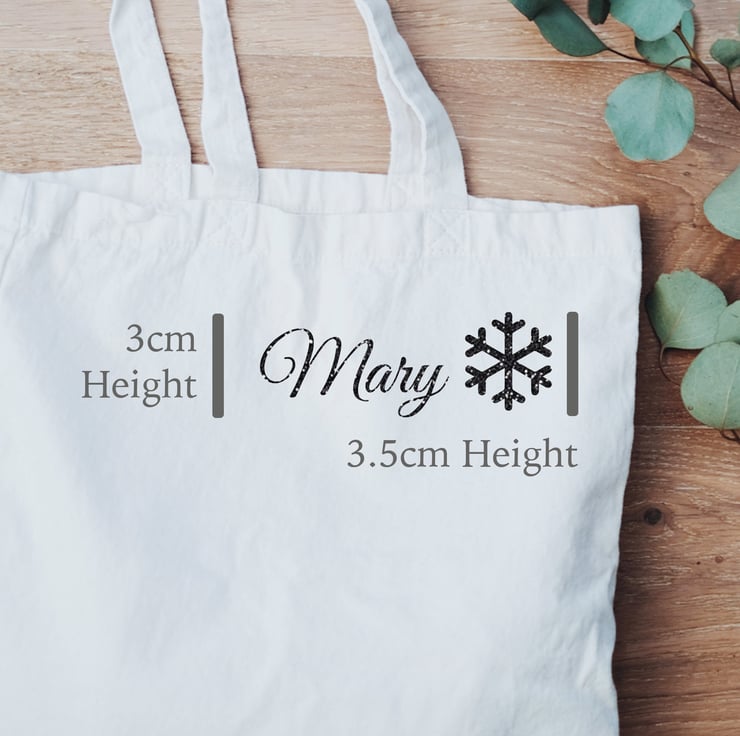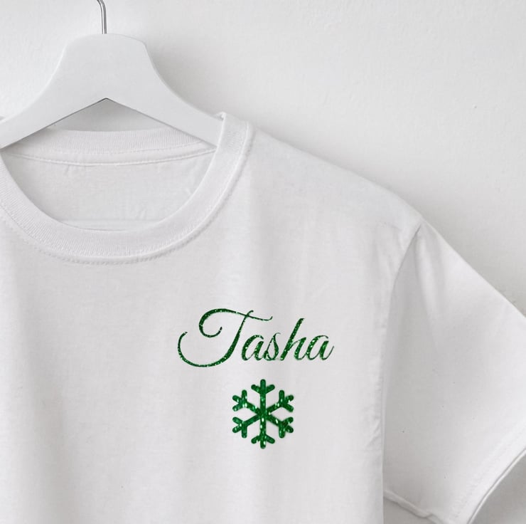 Snowflake personalised glitter iron on name label. Only suitable for polyester and cotton material. Great for t-shirt designs, wedding outfits and labels.