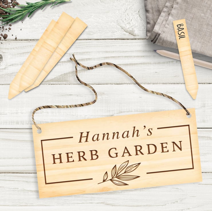 Beautiful personalised herb garden sign with blank markers available as a bundle. Complete the look of your herb garden with this rustic plaque. Add any name (up to 8 characters). Available as a plaque that sits in the soil, or as a hanging sign. Perfect gift for friends and family with a green thumb.