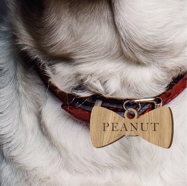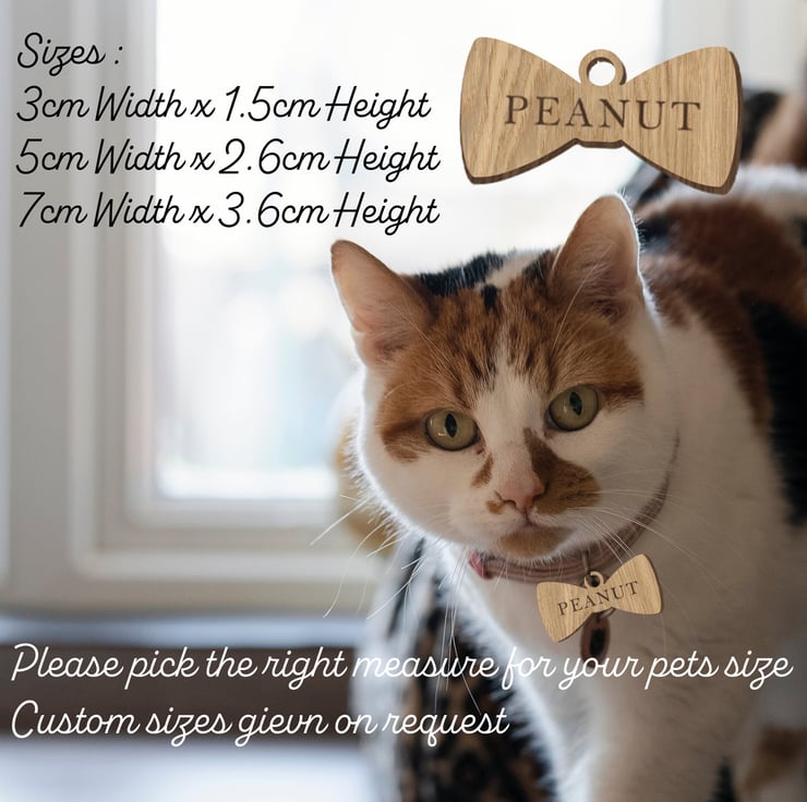 Bow tie personalised wooden tag pet's collar. With 6 beautiful premium wood to choose from and three sizes.