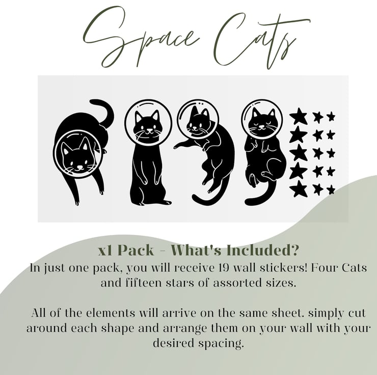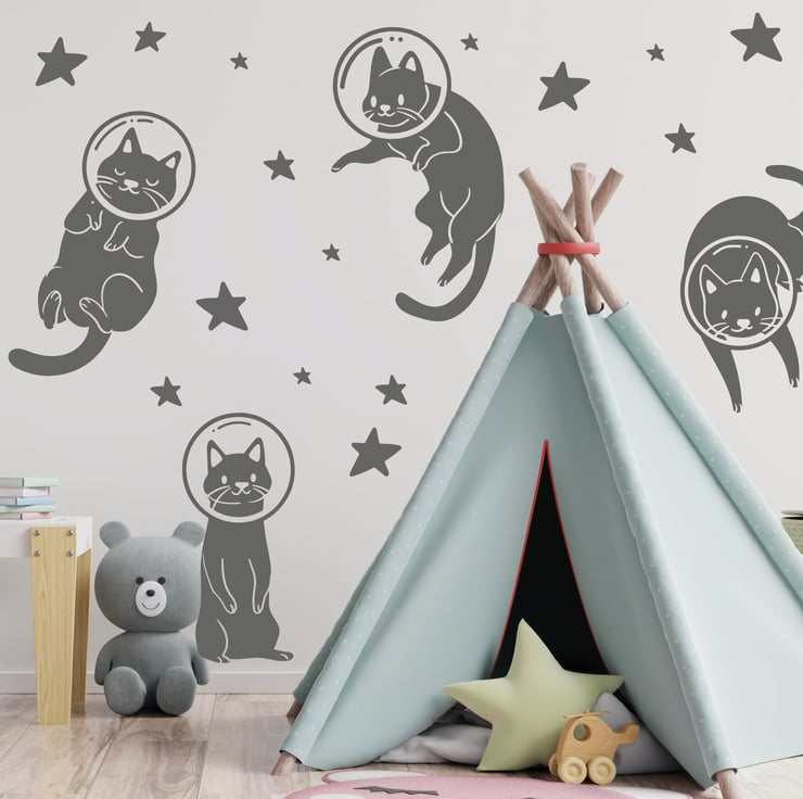 Our beautiful pack of astronaut Cat stickers is the perfect way to decorate your child's room. With a space theme, these stickers create an amazing fun contemporary aesthetic any space. They work especially well in a kid's Bedroom, Playroom Or Nursery. In just one pack, you will receive 19 wall stickers! Four Cats and fifteen stars of assorted sizes in your chosen colour!