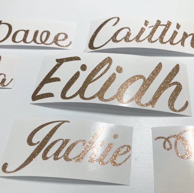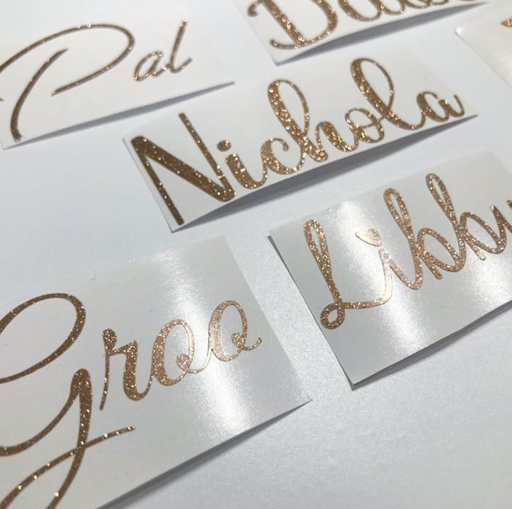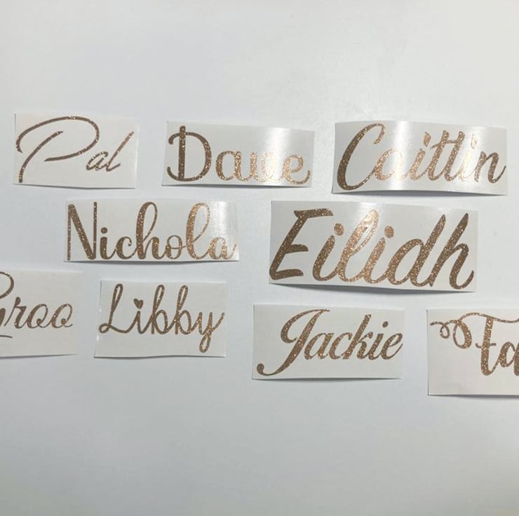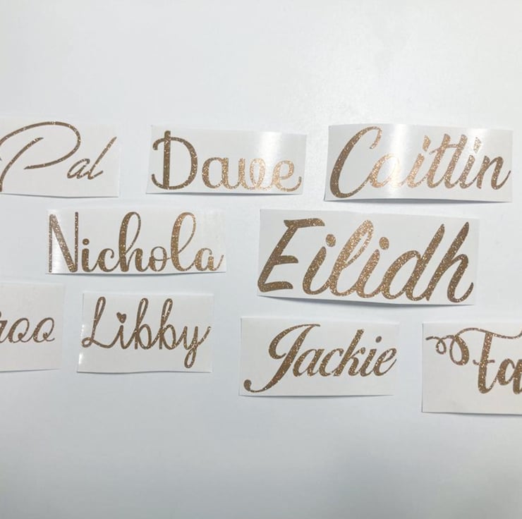 Beautiful personalised shiny Gold glitter stickers suitable for many occasions such as Weddings, Christenings, Birthdays, Hen Do etc. Also perfect for Bottles, Boxes, Glasses, Water Bottles and more.