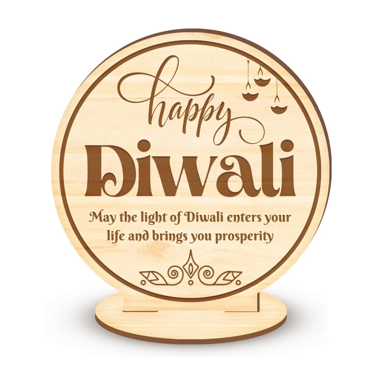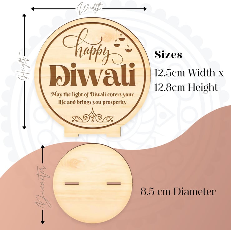 Add a touch of elegance to your Diwali decor with this beautiful wooden 'Happy Diwali' engraved sign. It's the perfect way to spread the festive cheer and welcome your loved ones into your home. With the stand included, this stunning decoration is sure to light up your space and capture the essence of the festival.
