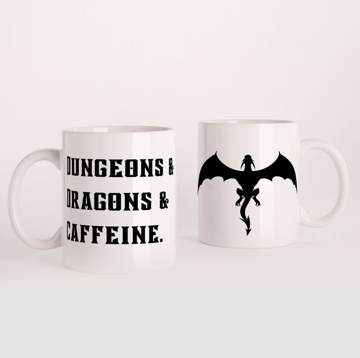 Calling all Dungeons and Dragons fanatics who need their daily dose of coffee! This mug is the ultimate game-changer. Whether you're battling dragons or simply facing a stacked schedule, this mug is the perfect companion for a caffeine boost. It makes an amazing gift for a fellow DnD adventurer or coffee aficionado. So, grab your trusty dice and brew up a storm in this 'Dungeons & Dragons & Caffeine' mug!