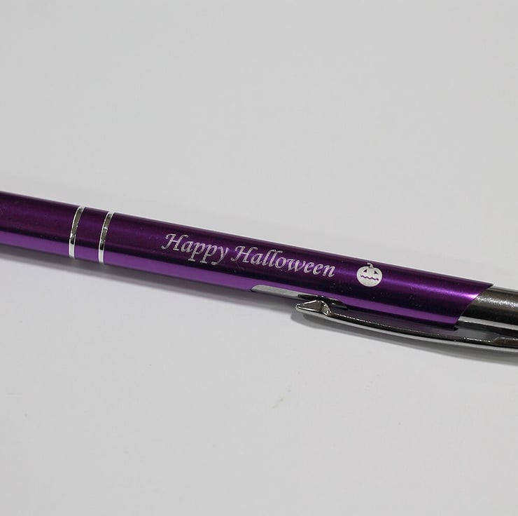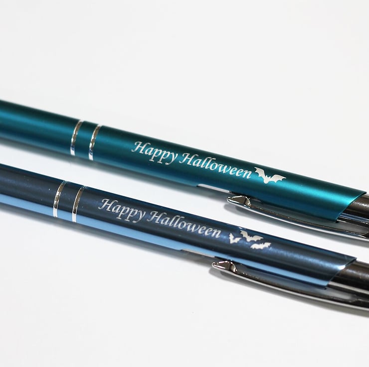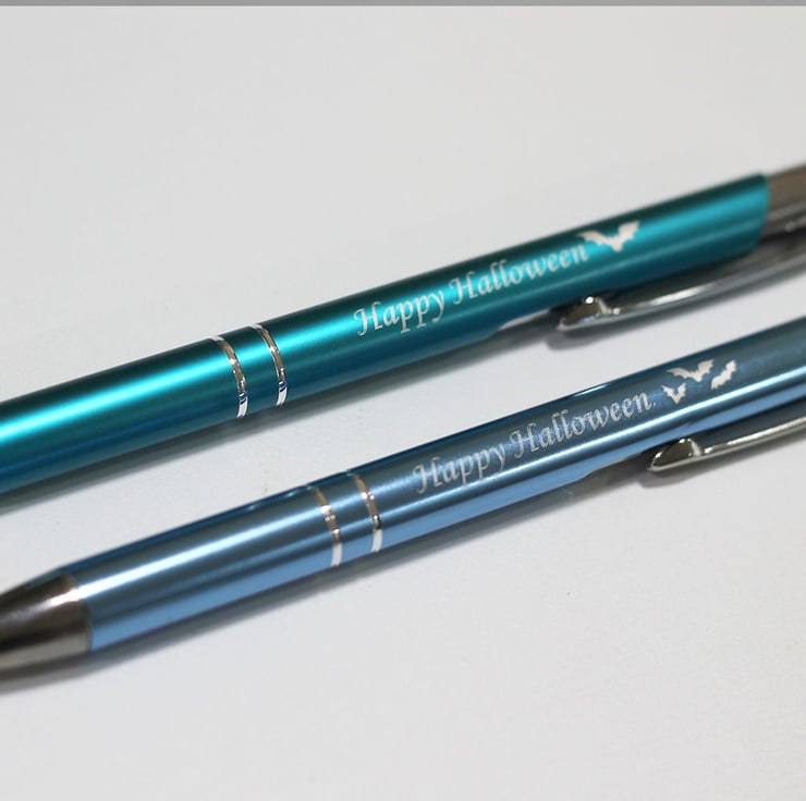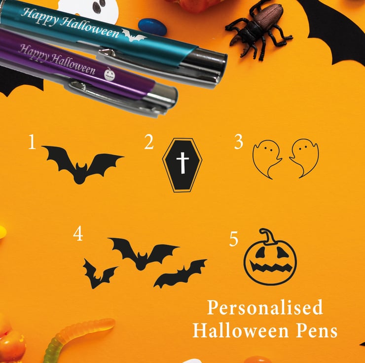 Beautiful personalised metal pens with a variety of Halloween symbol, suitable as a gift for a personalised Halloween gift for spooky season.