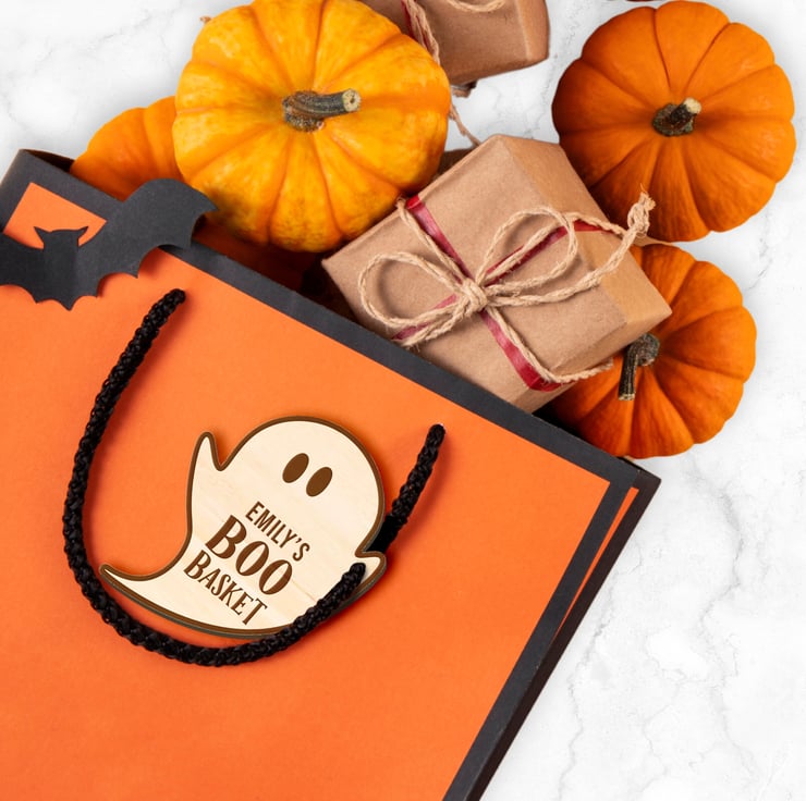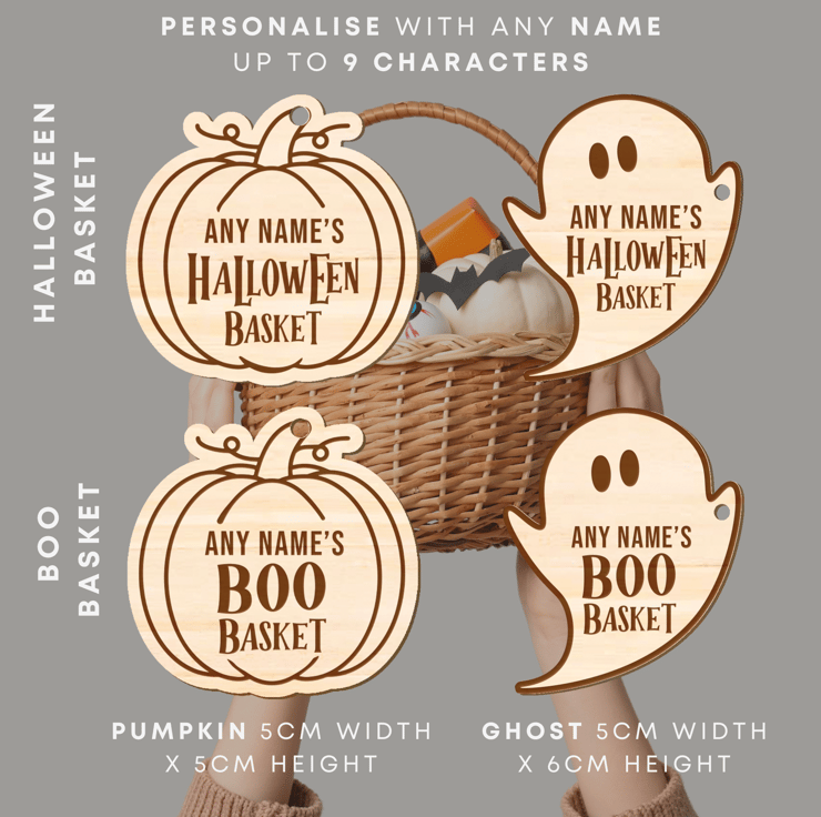 Crafted from quality wood, these tags are available in two fun shapes: a classic pumpkin and a cute ghost. Each tag can be customised with a name up to 9 characters, making them a unique addition to your Halloween presents. Whether you’re creating a “Boo Basket” or a “Halloween Basket,” these tags add a special touch that will delight any recipient.