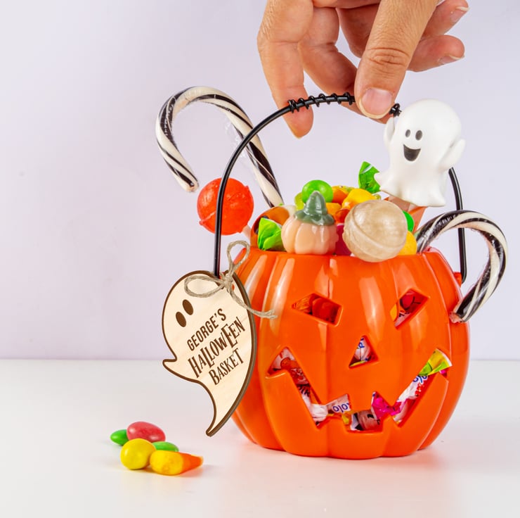 Halloween Basket Personalised Name Tag Trick Or Treat Ghost Pumpkin Bat Custom