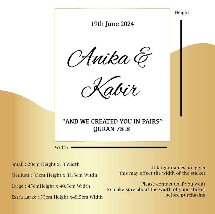 Personalise the sticker with two names (9 characters max each) and a date. With four sizes to choose from. We copy and paste the names and dates so please make sure you have everything spelled and checked over.