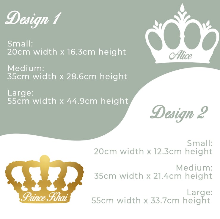 There are two designs to choose from. The colour will change the crown, with the personalised name picked out of the sticker (up to 9 characters - the longer the name the smaller the writing will potentially be).
