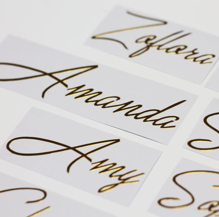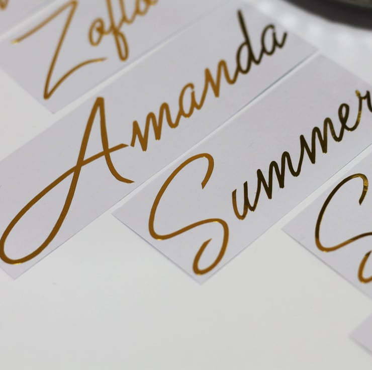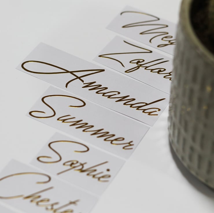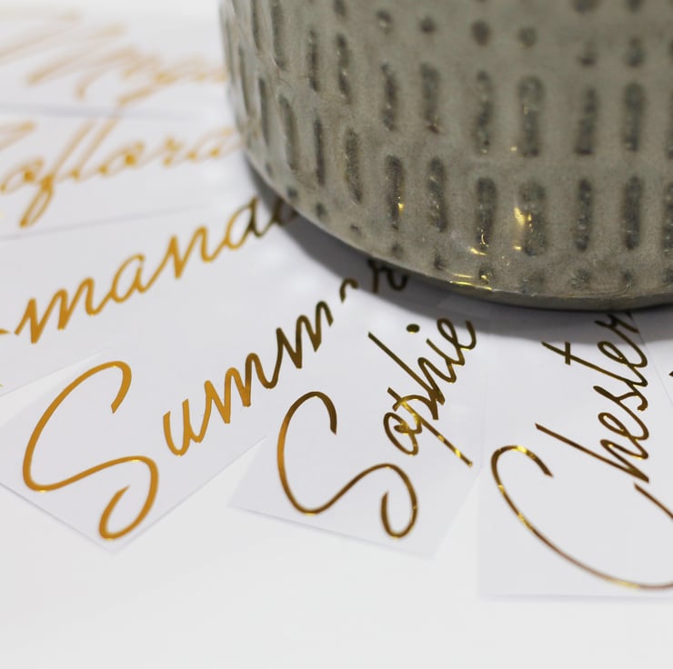 Beautiful personalised shiny cursive chrome gold stickers suitable for many occasions such as Weddings, Christenings, Birthdays, Hen Do etc. Also perfect for Bottles, Boxes, Glasses, Water Bottles and more.